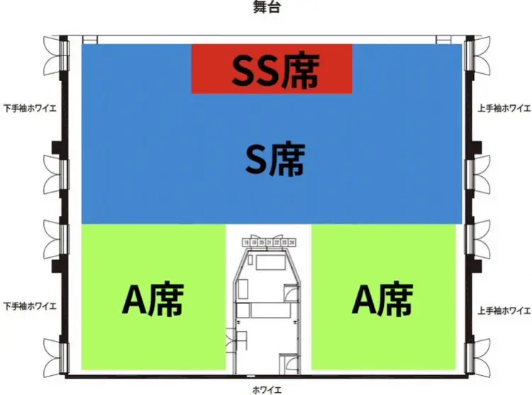 今回の座席配置につきましては、演出・ステージ構造・動線などを踏まえ、ステージ全体を見渡しやすい視点を重視した上で、「中央エリア」をSS席として設定しております。